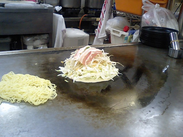 生地焼いてキャベツのっけて具のせるのら(o・・o)しろしまのお店としてはキャベツの量少なめだって。